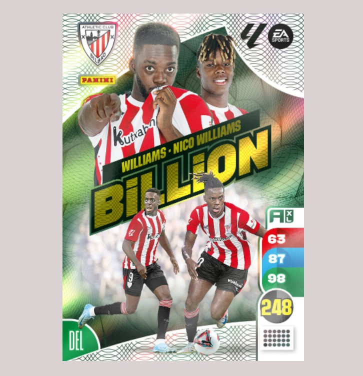 Carta especial original BILLION del ATHLETIC CLUB BILBAO con Williams y Nico Williams, perteneciente a la colección de Adrenalyn XL 24/25 La Liga de Panini.