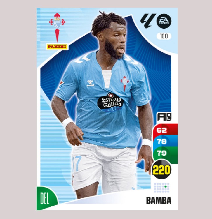 Carta básica original de BAMBA del RC Celta, número 108 de la colección de Adrenalyn XL 24/25 La Liga de Panini.