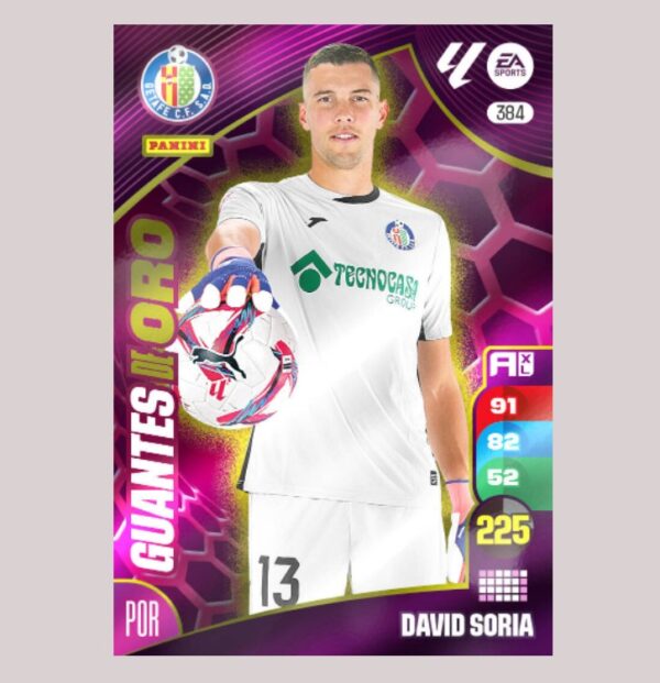 Carta especial original de DAVID SORIA del GETAFE CF de la sección GUANTES DE ORO, número 384 de la colección de Adrenalyn XL 24/25 La Liga de Panini.