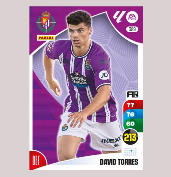 Carta básica original de DAVID TORRES del Real Valladolid CF, número 329 de la colección de Adrenalyn XL 24/25 La Liga de Panini.