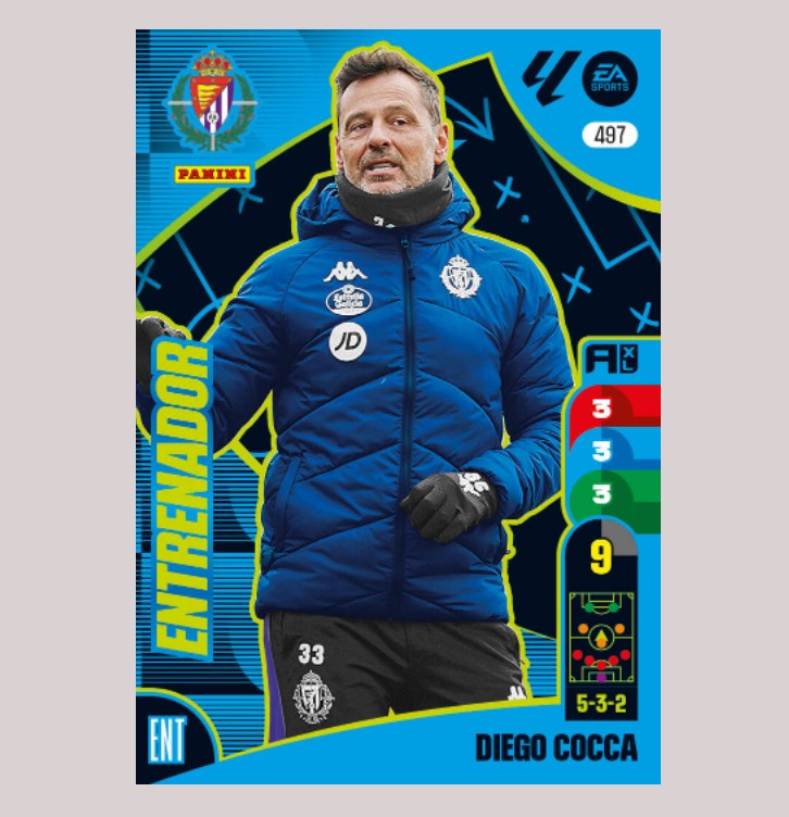 Carta especial original de DIEGO COCCA del Real Valladolid CF de la sección ENTRENADORES, número 497 de la colección de Adrenalyn XL 24/25 La Liga de Panini.