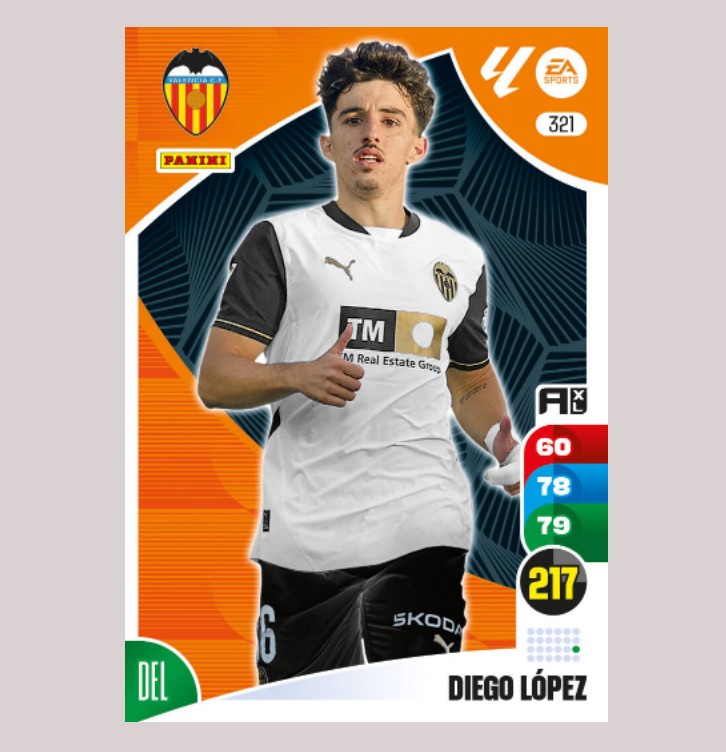 Carta básica original de DIEGO LÓPEZ del Valencia CF, número 321 de la colección de Adrenalyn XL 24/25 La Liga de Panini.