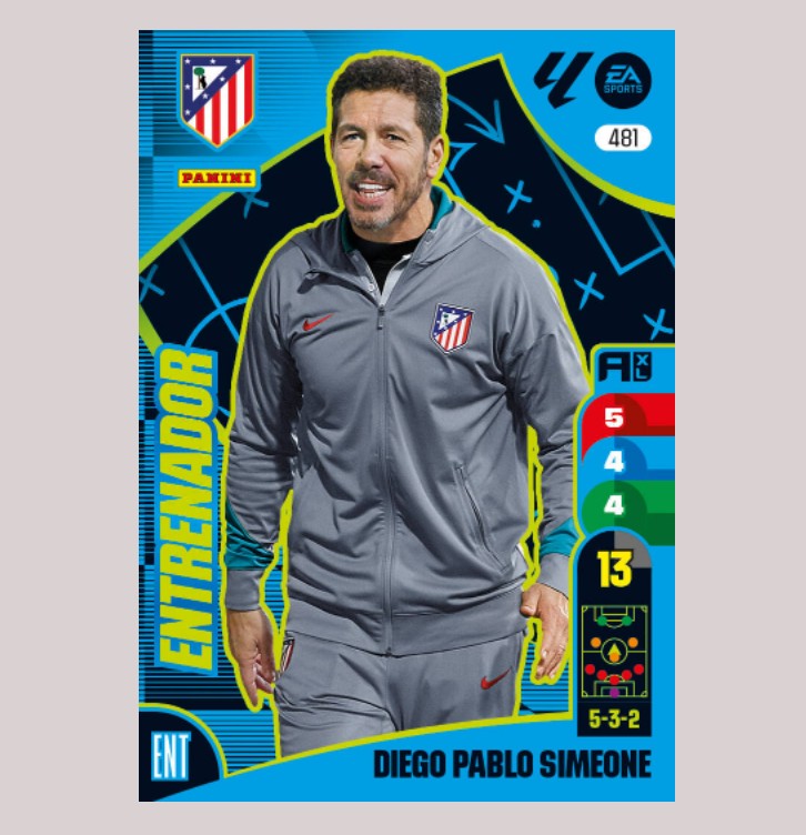 Carta especial original de DIEGO PABLO SIMEONE del Atlético de Madrid de la sección ENTRENADORES, número 481 de la colección de Adrenalyn XL 24/25 La Liga de Panini.