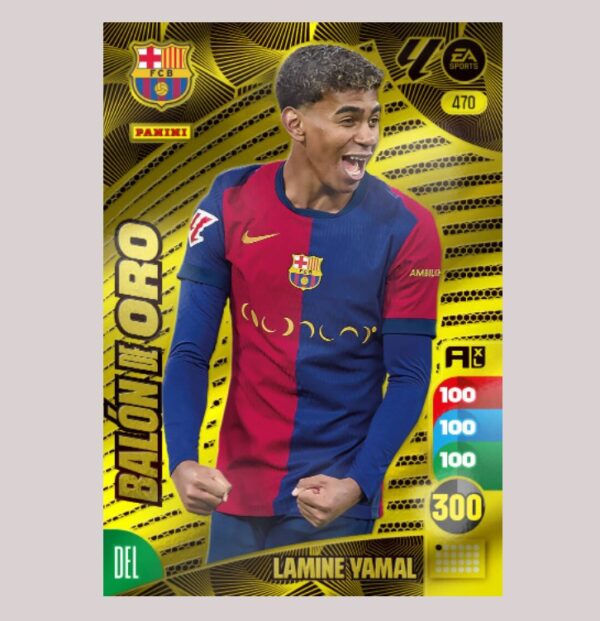 Carta especial original de LAMINE YAMAL del FC Barcelona de la sección BALÓN DE ORO, número 470 de la colección de Adrenalyn XL 24/25 La Liga de Panini.
