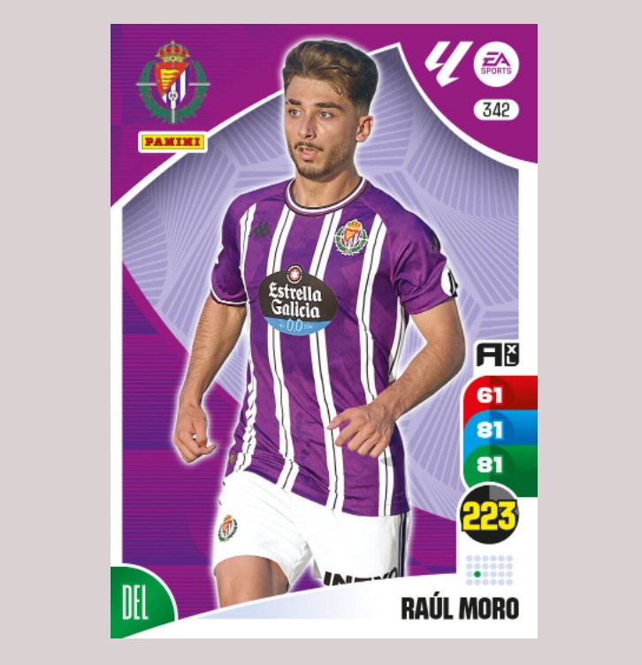 Carta básica original de RAÚL MORO del Real Valladolid CF, número 342 de la colección de Adrenalyn XL 24/25 La Liga de Panini.
