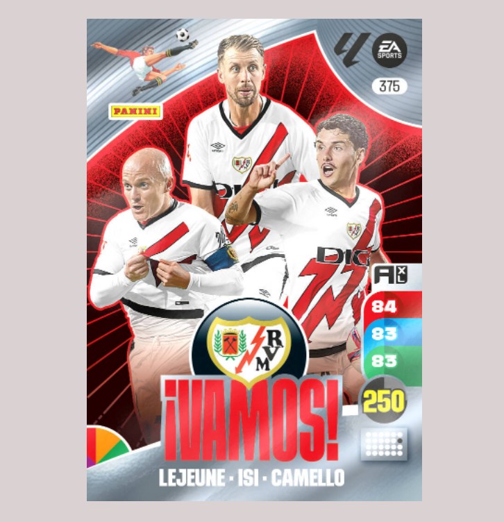 Carta especial original ¡VAMOS! del RAYO VALLECANO con Lejeune, Isi y Camello, número 375 de la colección de Adrenalyn XL 24/25 La Liga de Panini.