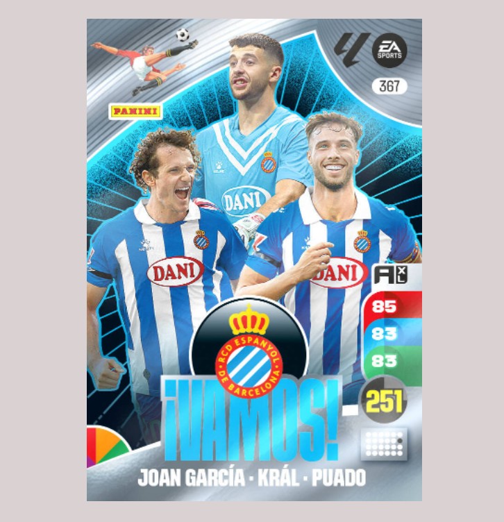 Carta especial original ¡VAMOS! del RCD ESPANYOL con Joan García, Král y Puado, número 367 de la colección de Adrenalyn XL 24/25 La Liga de Panini.