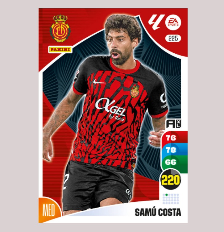 Carta básica original de SAMÚ COSTA del RCD Mallorca, número 225 de la colección de Adrenalyn XL 24/25 La Liga de Panini.