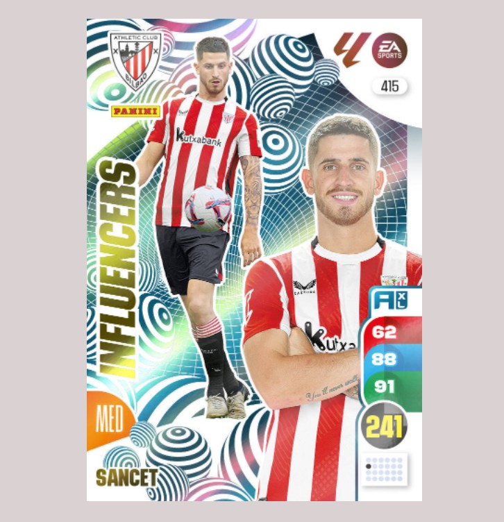 Carta especial original de SANCET del Athletic Club Bilbao de la sección INFLUENCERS, número 415 de la colección de Adrenalyn XL 24/25 La Liga de Panini.