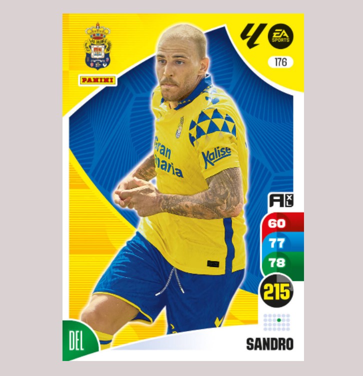 Carta básica original de SANDRO del UD Las Palmas, número 176 de la colección de Adrenalyn XL 24/25 La Liga de Panini.