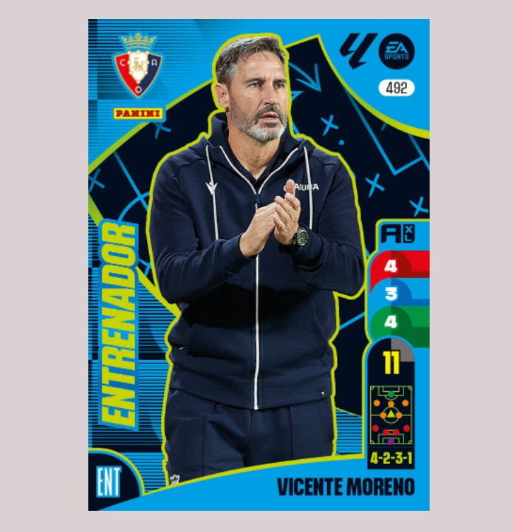 Carta especial original de VICENTE MORENO del CA Osasuna de la sección ENTRENADORES, número 492 de la colección de Adrenalyn XL 24/25 La Liga de Panini.